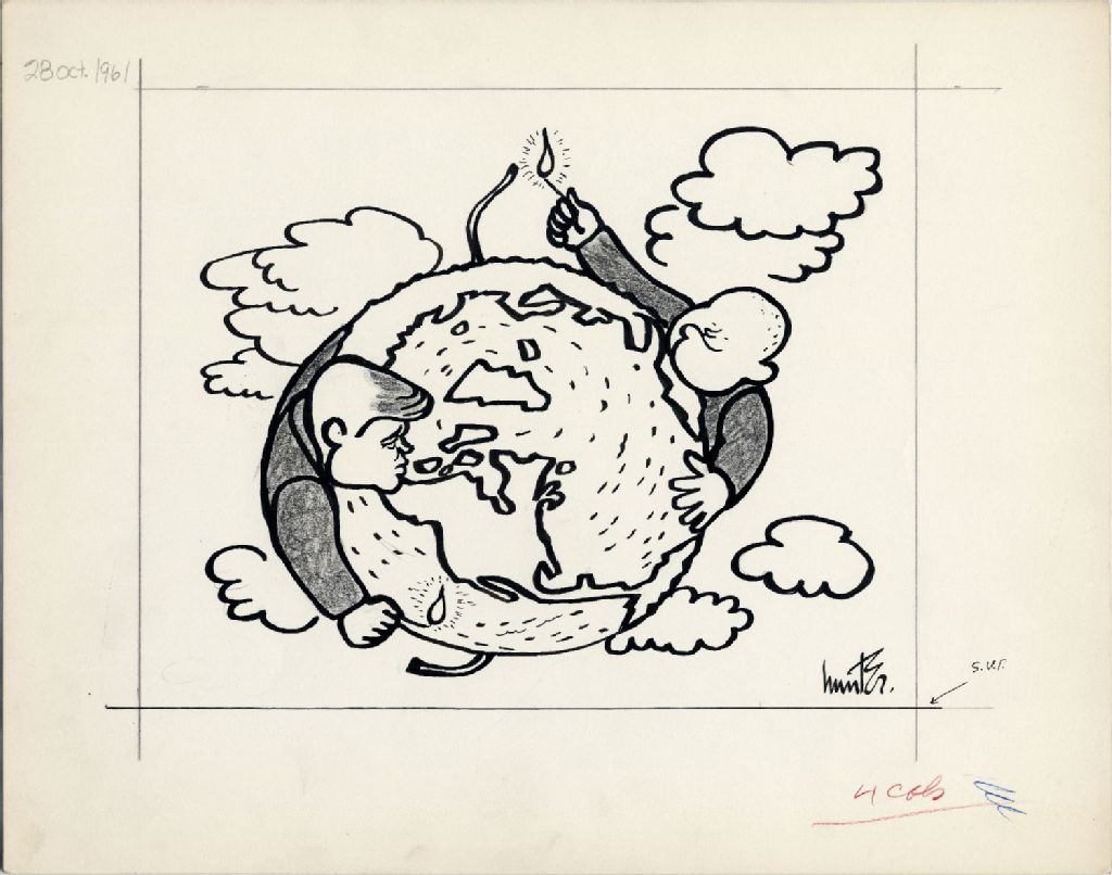 [John F. Kennedy, président américain et Nikita Khrouchtchev, président de l'U.R.S.S. entourent la terre de leurs bras, chacun de leur côté. Khrouchtchev allume une mèche qui sort de la Terre, comme une bombe]], 28 octobre 1961, Archives nationales à Québec, Fonds Raoul Hunter, (03Q,P716,S1,P61-10-28), Raoul Hunter.