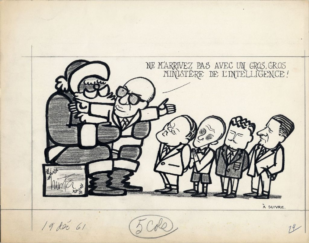 [Georges-Émile Lapalme et le Père Noël:] Ne m'arrivez pas avec un gros gros ministère de l'intelligence, 19 décembre 1961, Archives nationales à Québec, Fonds Raoul Hunter, (03Q,P716,S1,P61-12-19), Raoul Hunter.