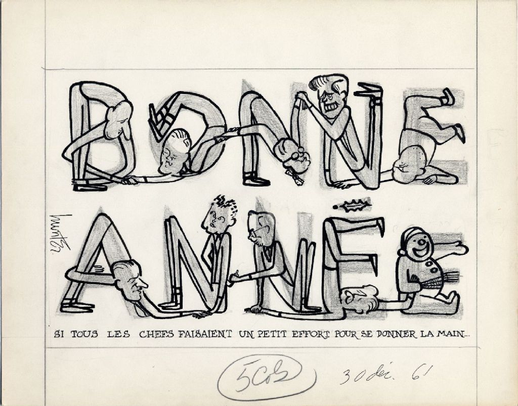 Bonne Année. Si tous les chefs faisaient un petit effort pour se donner la main..., 30 décembre 1961, Archives nationales à Québec, Fonds Raoul Hunter, (03Q,P716,S1,P61-12-30), Raoul Hunter.