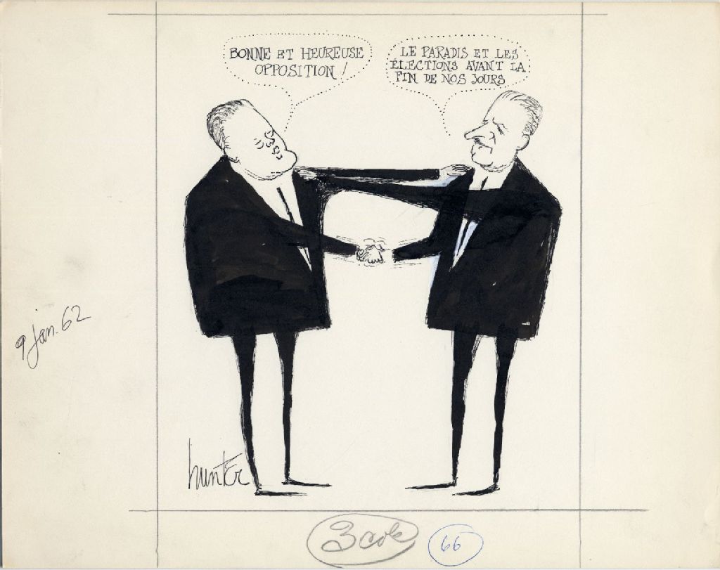 [Jean Lesage :] Bonne et heureuse année [Daniel Johnson :] Le paradis et les élections avant la fin de nos jours, 9 janvier 1962, Archives nationales à Québec, Fonds Raoul Hunter, (03Q,P716,S1,P62-01-09), Raoul Hunter.