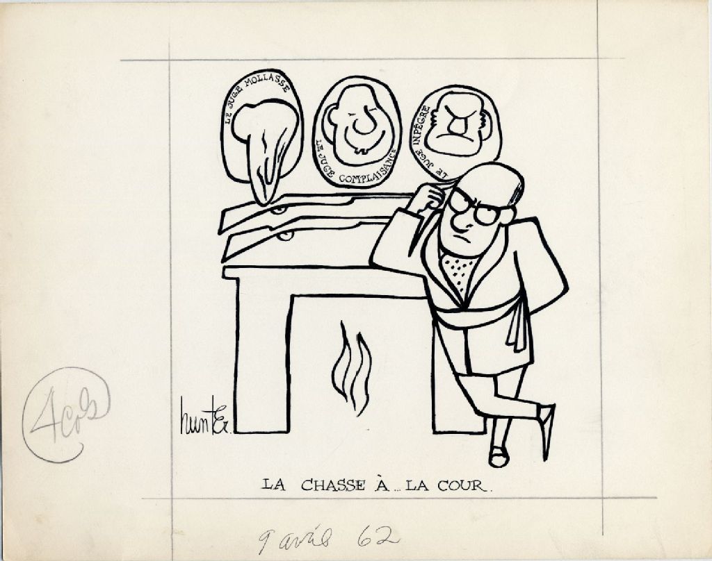 La chasse à … la cour - Le juge molasse, le juge complaisance, le juge inpègre, 9 avril 1962, Archives nationales à Québec, Fonds Raoul Hunter, (03Q,P716,S1,P62-04-09), Raoul Hunter.