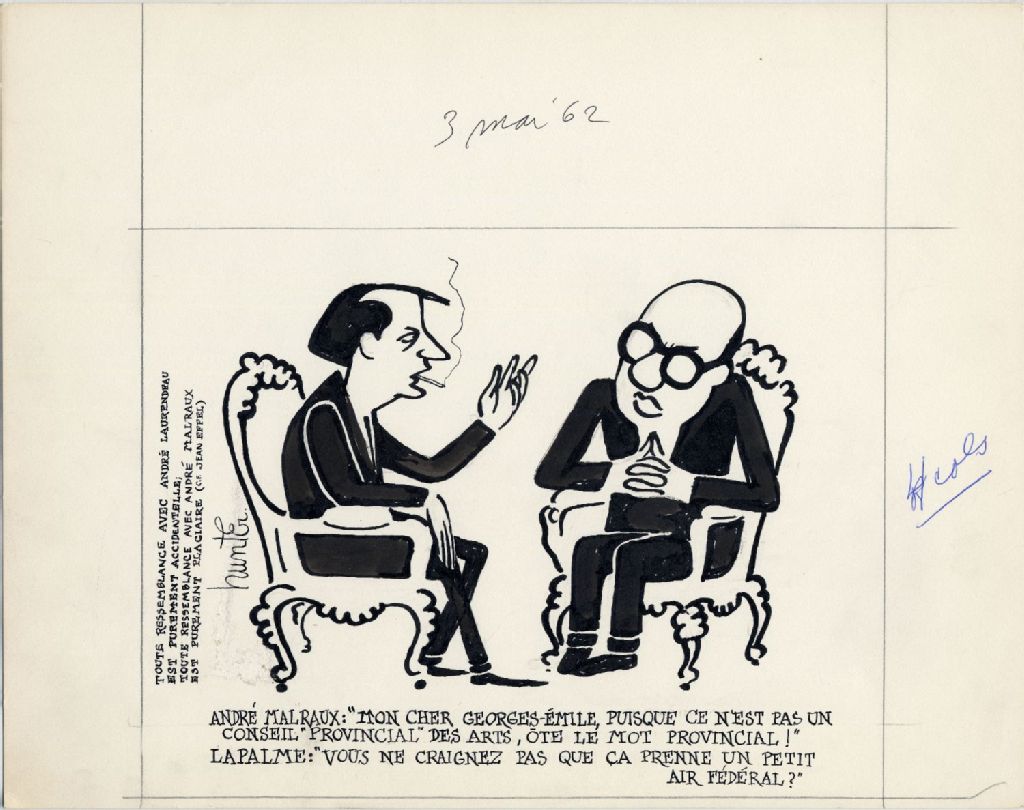 André Malraux : " Mon cher Georges-Émile, puisque ce n'est pas un conseil "provincial" des arts, ôte le mot provincial !" Lapalme : " Vous ne craignez pas que ça prenne un petit air fédéral ?"