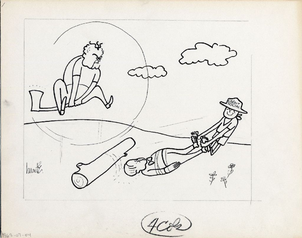 [John Diefenbaker tient une hache et essai de trancher le cou de Lester B. Pearson, mais un enfant portant un chapeau où il est écrit ''Crédit social'' tire Pearson par les pieds et l'empêche de se faire couper le cou]