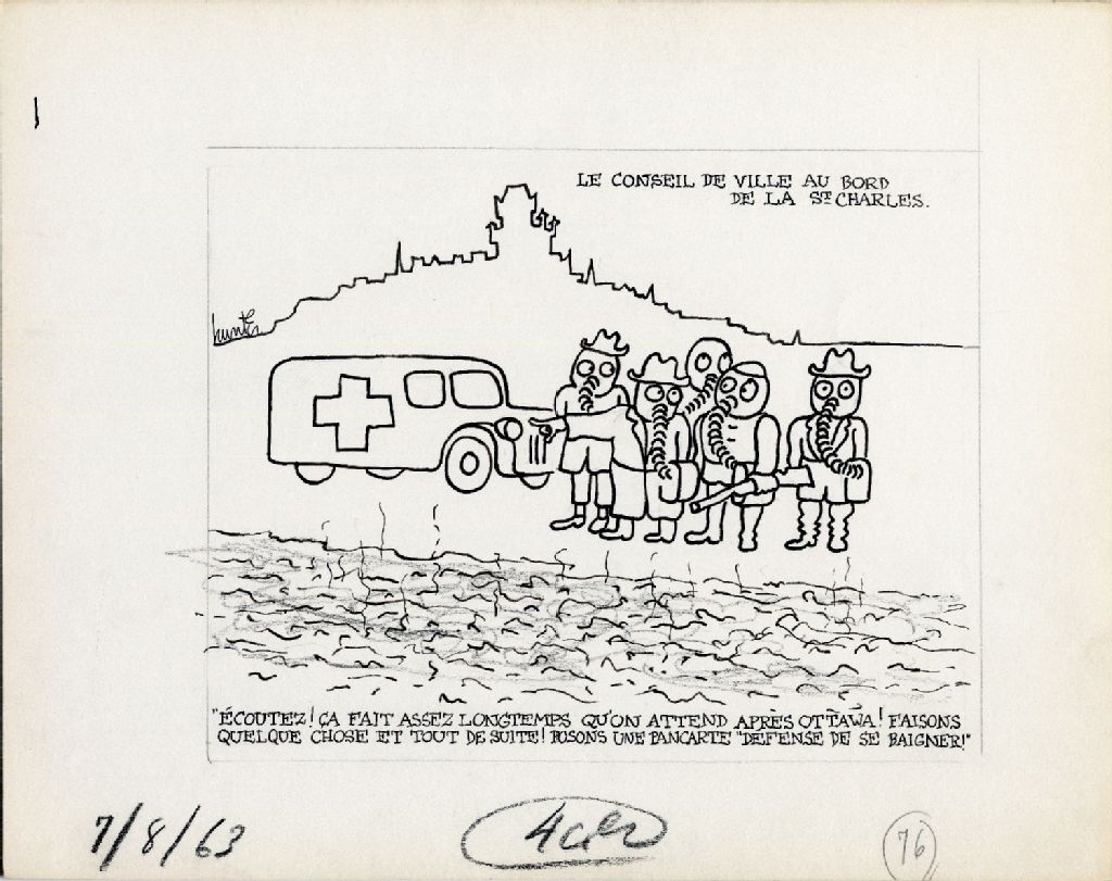Le Conseil de ville au bord de la St-Charles : " Écoutez! Ça fait assez longtemps qu'on attend après Ottawa! Faisons quelque chose et tout de suite! Posons une pancarte "Défense de se baigner!", 7 août 1963, Archives nationales à Québec, Fonds Raoul Hunter, (03Q,P716,S1,P63-08-07), Raoul Hunter.