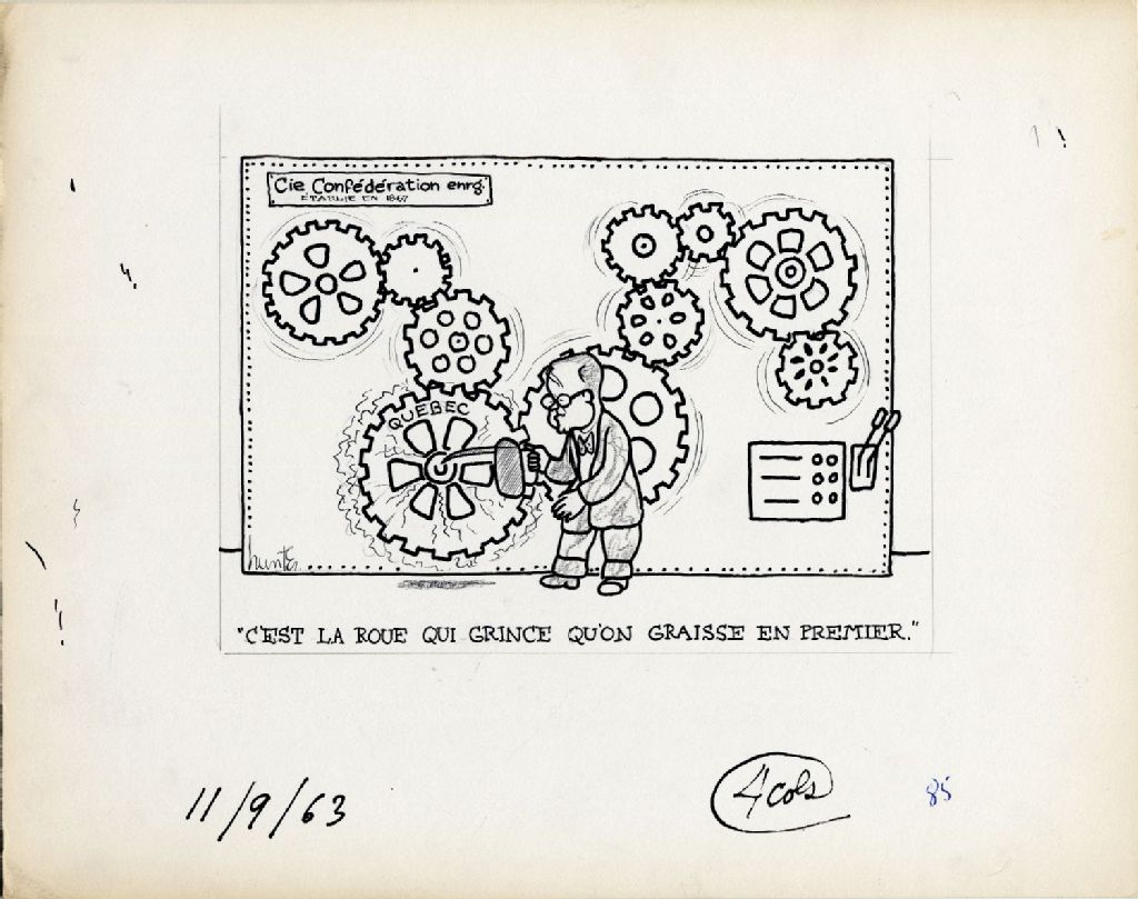 " C'est la roue qui grince qu'on graisse en premier ", 11 septembre 1963, Archives nationales à Québec, Fonds Raoul Hunter, (03Q,P716,S1,P63-09-11), Raoul Hunter.