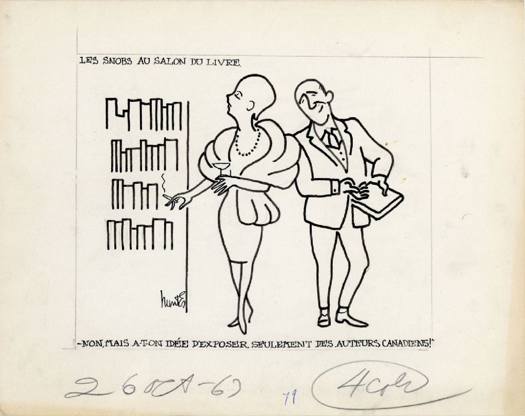 Les snobs au Salon du livre. - Non, mais a-t-on idée d'exposer seulement des auteurs canadiens! ", 26 octobre 1963, Archives nationales à Québec, Fonds Raoul Hunter, (03Q,P716,S1,P63-10-26), Raoul Hunter.