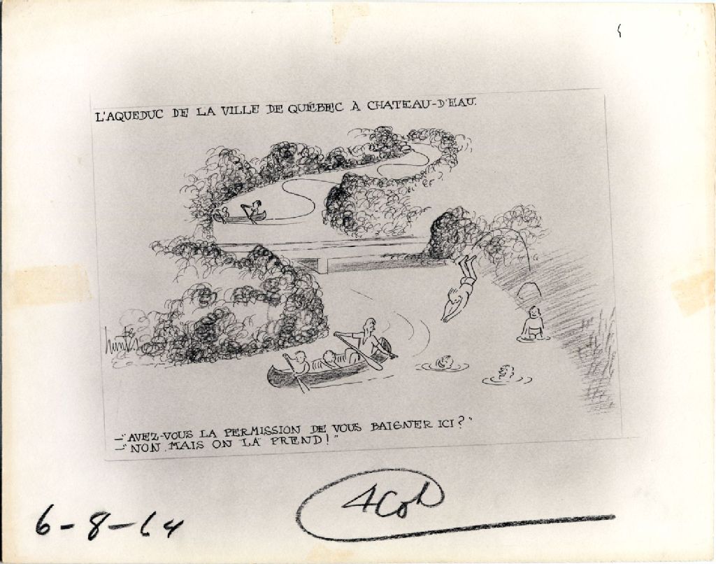 L'aqueduc de la ville de Québec à Château-d'eau. -«Avez-vous la permission de vous baigner ici?» -«Non, mais on la prend!», 6 août 1964, Archives nationales à Québec, Fonds Raoul Hunter, (03Q,P716,S1,P64-08-06), Raoul Hunter.