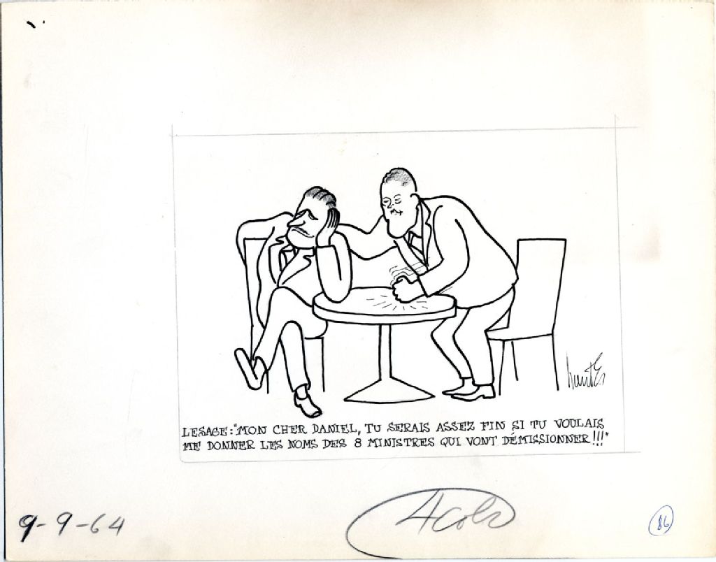 Lesage : «Mon cher Daniel, tu serais assez fin si tu voulais me donner les noms des 8 ministres qui vont démissionner!!!», 9 septembre 1964, Archives nationales à Québec, Fonds Raoul Hunter, (03Q,P716,S1,P64-09-09), Raoul Hunter.