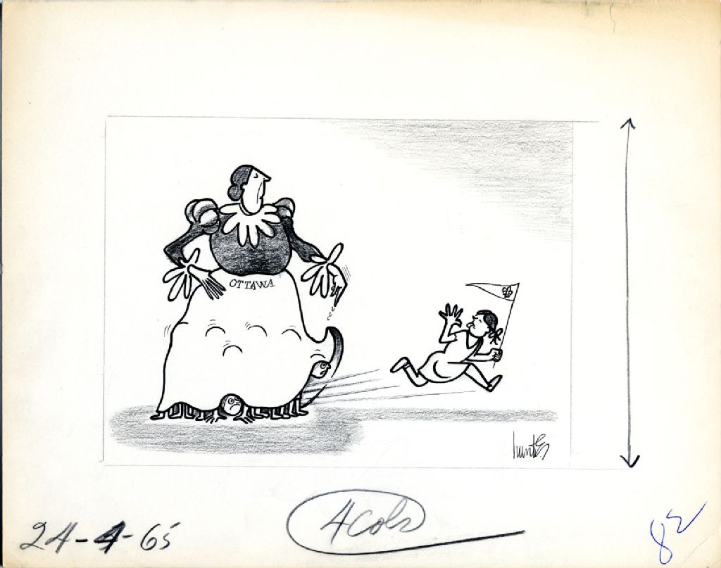 [Un enfant portant un drapeau avec une fleur de lys se sauve en faisant la grimace. Une femme cache sous sa robe d'autres enfants. Sur sa robe il est écrit: Ottawa]