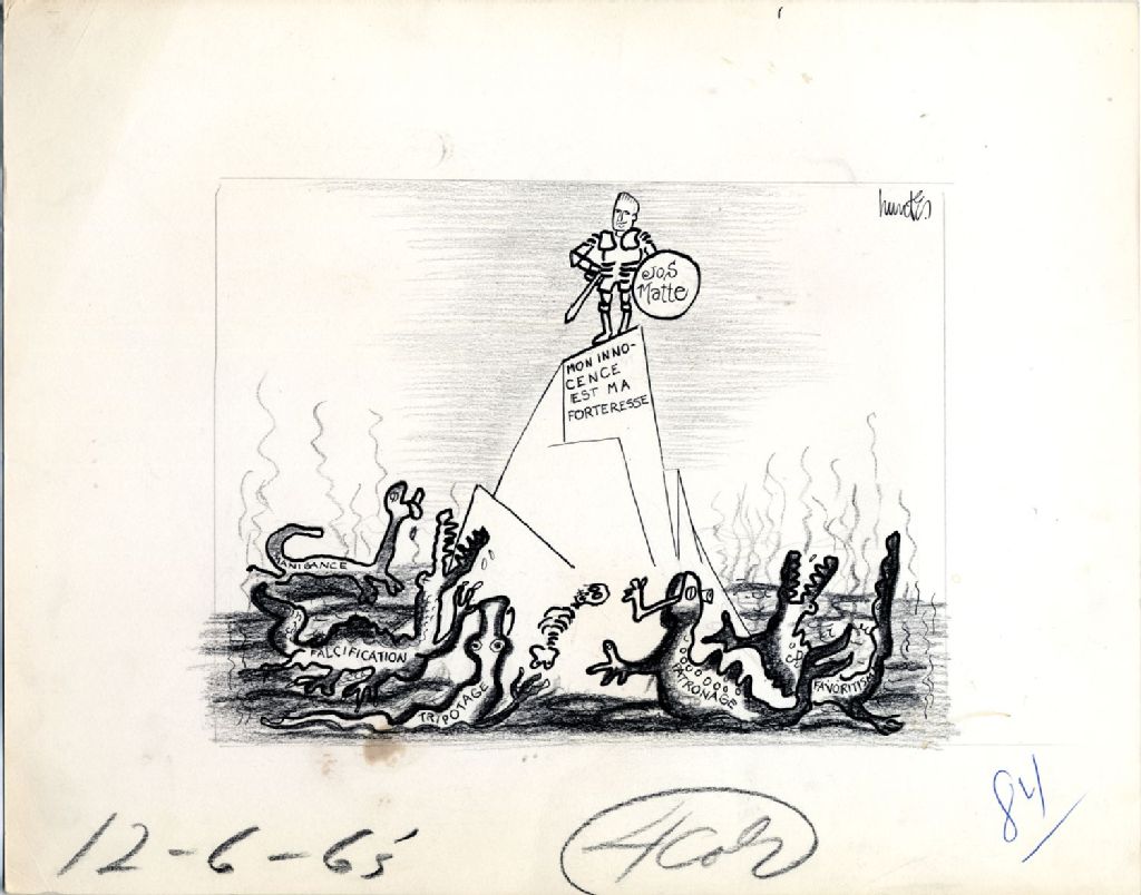 [Jos Matte sur un rocher où est inscrit «Mon innocence est ma forteresse»], 12 juin 1965, Archives nationales à Québec, Fonds Raoul Hunter, (03Q,P716,S1,P65-06-12), Raoul Hunter.