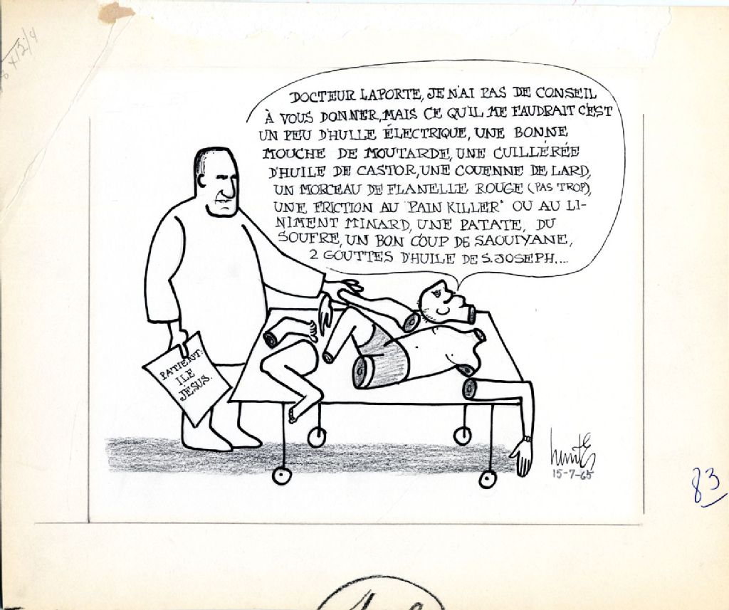 On peut voir un homme démembré sur la table d'opération et disant : «Docteur Laporte, je n'ai pas de conseil à vous donner, mais ce qu'il me faudrait c'est un peu d'huile électrique, une bonne mouche de moutarde, une cuillérée d'huile de castor, une couenne de lard, un morceau de flanelle rouge (pas trop), une friction au "pain killer" ou au liniment minard, une patate, du soufre, un bon coup de saouiyane, 2 gouttes d'huile de S. Joseph...»