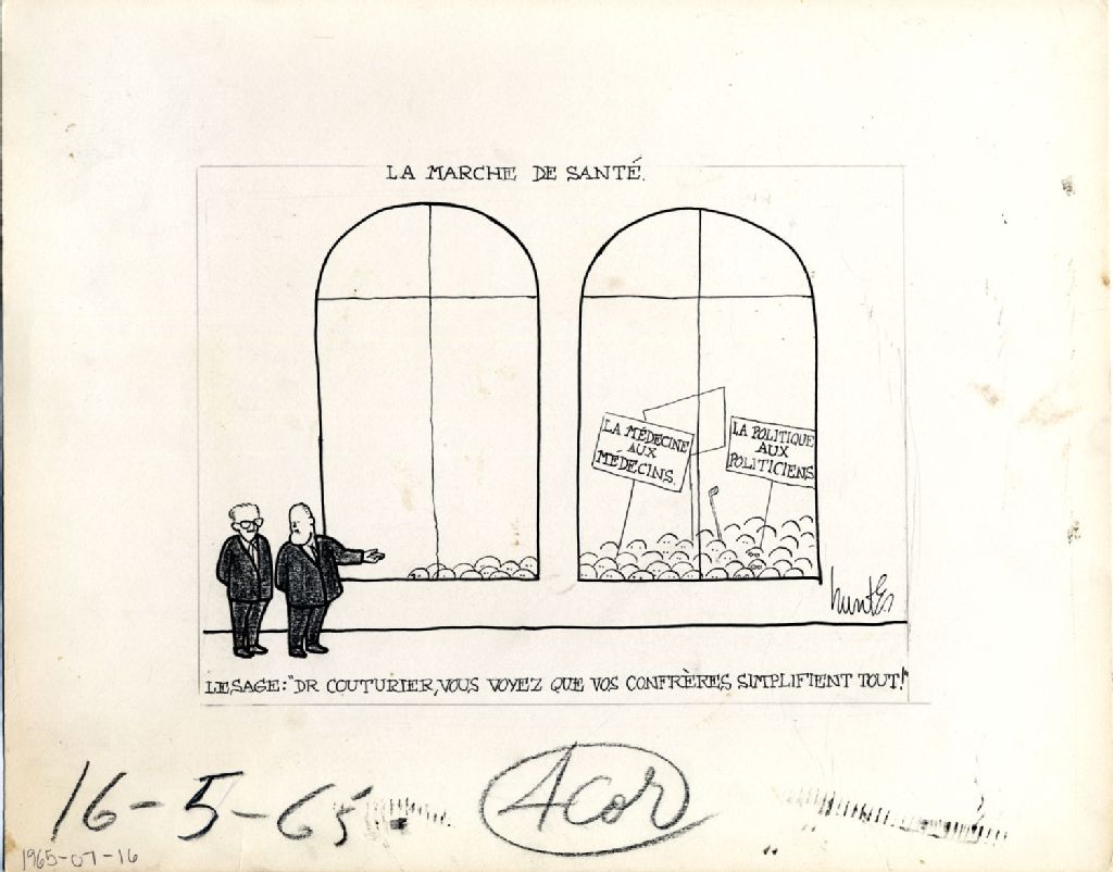 Le marché de santé. Lesage: «Dr Couturier, vous voyez que vos confrères simplifient tout!», 16 juillet 1965, Archives nationales à Québec, Fonds Raoul Hunter, (03Q,P716,S1,P65-07-16), Raoul Hunter.