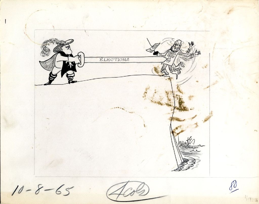 [Un mousquetaire pousse de son épée un homme sur le bord d'une falaise. Sur l'épée du mousquetaire on peut lire: ''élections'' et sur la toge de l'homme qu'il pousse ''conseil législatif''], 10 août 1965, Archives nationales à Québec, Fonds Raoul Hunter, (03Q,P716,S1,P65-08-10), Raoul Hunter.