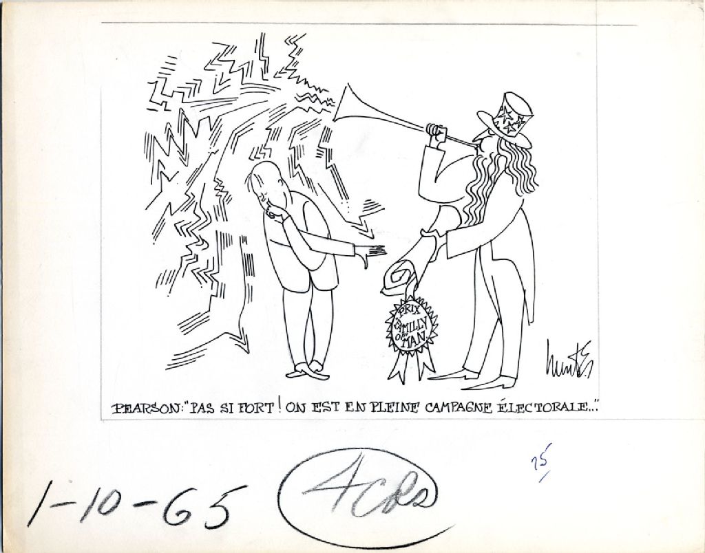 Pearson: «Pas si fort! On est en pleine campagne électorale…», 1er octobre 1965, Archives nationales à Québec, Fonds Raoul Hunter, (03Q,P716,S1,P65-10-01), Raoul Hunter.