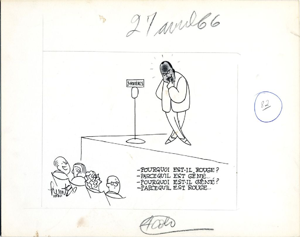 [Un homme est sur scène. Dans le public des gens disent: ''Pourquoi est-il rouge?'' ''Parce qu'il est gêné'' ''Pourquoi est-il gêné?'' ''Parce qu'il est rouge!''], 27 avril 1966, Archives nationales à Québec, Fonds Raoul Hunter, (03Q,P716,S1,P66-04-27), Raoul Hunter.