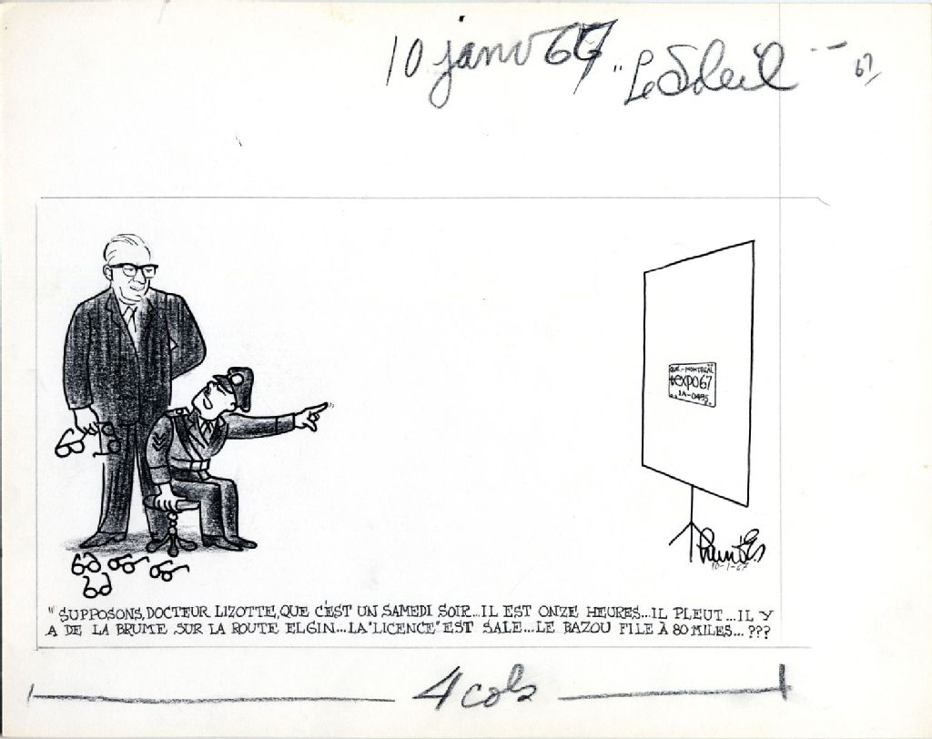 «Supposons, docteur Lizotte, que c'est un samedi soir… Il est onze heures… Il pleut… Il y a de la brume sur la route Elgin… La "licence" est sale… le bazou file à 80 miles…???»