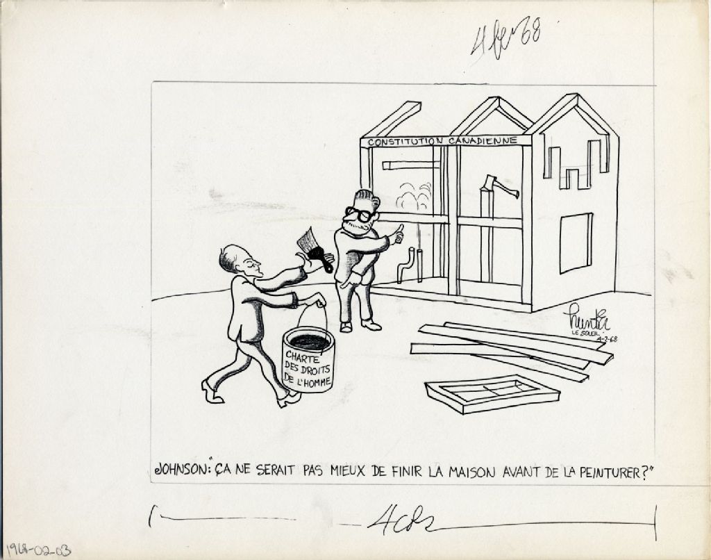Johnson : «Ça ne serait pas mieux de finir la maison avant de la peinturer?», 4 février 1968, Archives nationales à Québec, Fonds Raoul Hunter, (03Q,P716,S1,P68-02-04), Raoul Hunter.