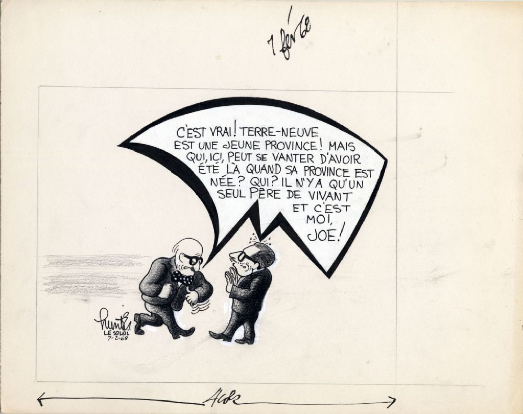 «C'est vrai! Terre-Neuve est une jeune province! Mais qui, ici, peut se vanter d'avoir été là quand sa province est née? Qui? Il n'y a qu'un seul père de vivant et c'est moi Joe!»