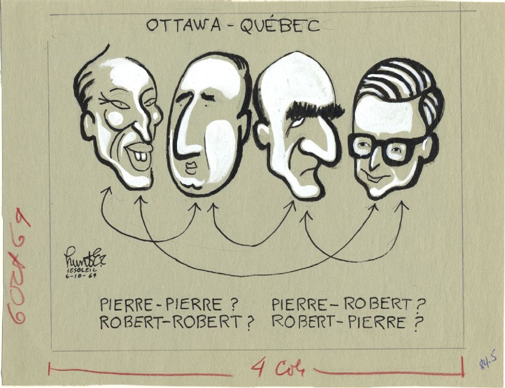 Ottawa - Québec. Pierre-Pierre? Robert-Robert? Pierre-Robert? Robert-Pierre, 6 octobre 1969, Archives nationales à Québec, Fonds Raoul Hunter, (03Q,P716,S1,P69-10-06), Raoul Hunter.