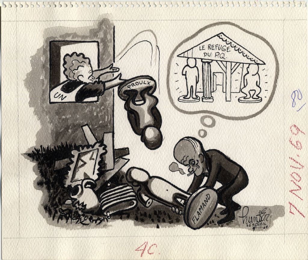 [René Lévesque ramasse une statue sur laquelle il est écrit ''Flamand'' en pensant au ''Refuge du PQ'']