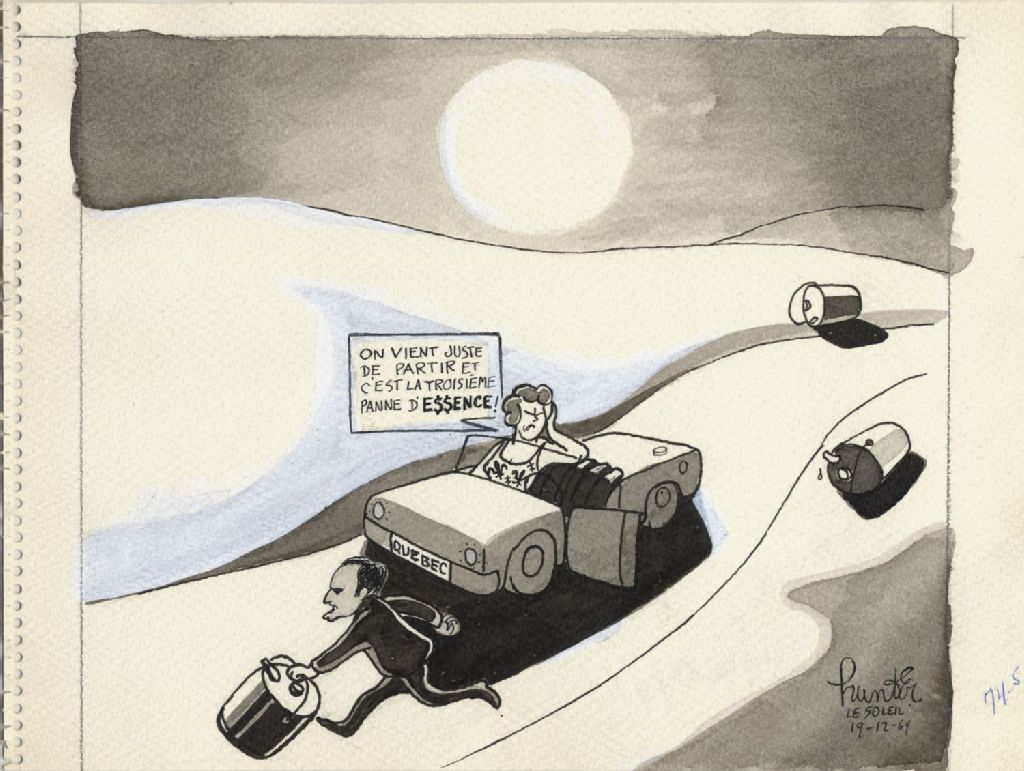 «On vient juste de partir et c'est la troisième panne d'e$$ence!», 19 décembre 1969, Archives nationales à Québec, Fonds Raoul Hunter, (03Q,P716,S1,P69-12-19), Raoul Hunter.