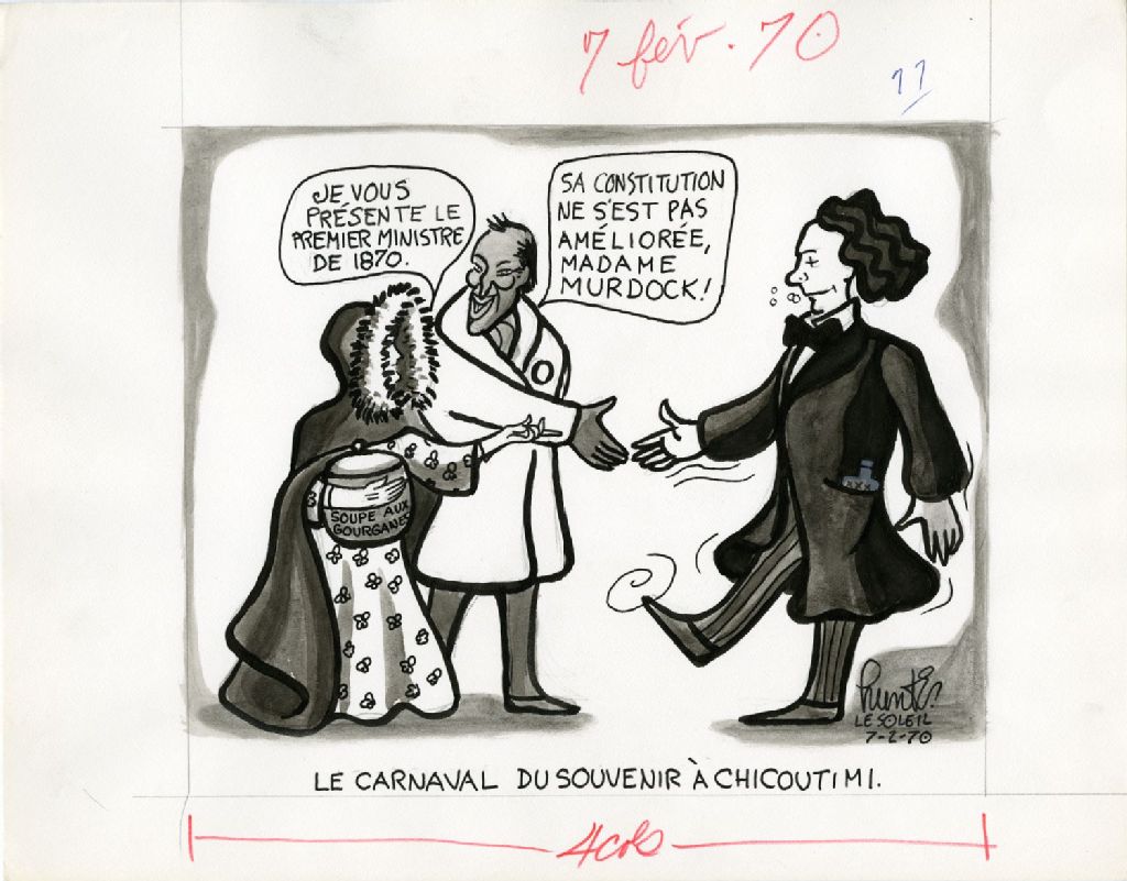 Le carnaval du souvenir à Chicoutimi. [Femme] : «Je vous présente le premier ministre de 1870» [Trudeau] : «Sa constitution ne s'est pas améliorée, madame Murdock!»