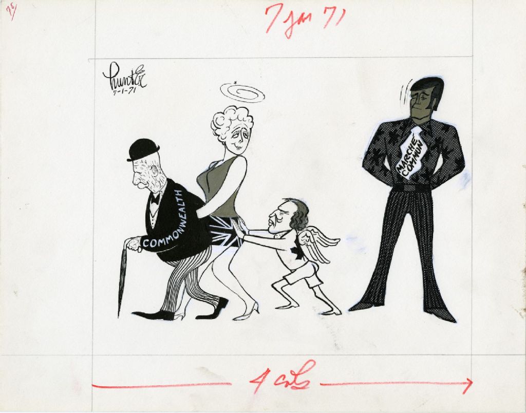 [Pierre-Elliott Trudeau pousse une femme et un vieil homme sur lequel il est écrit Commonwealth], 7 janvier 1971, Archives nationales à Québec, Fonds Raoul Hunter, (03Q,P716,S1,P71-01-07), Raoul Hunter.
