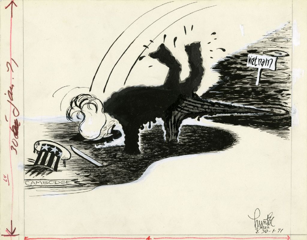 [''Uncle Sam'' tombe dans une flaque de boue ou de pétrole. On peut voir une affiche où il est écrit ''Vietnam''], 30 janvier 1971, Archives nationales à Québec, Fonds Raoul Hunter, (03Q,P716,S1,P71-01-30), Raoul Hunter.