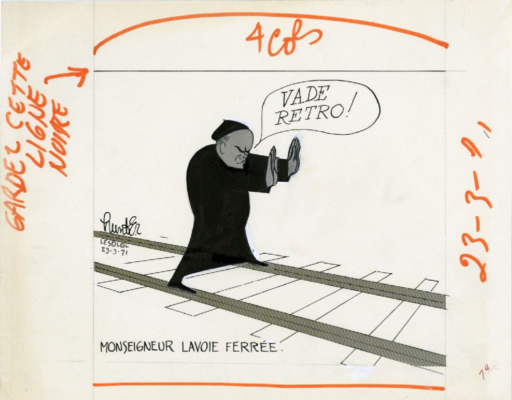 Monseigneur Lavoie ferrée. «Vade Retro!», 23 mars 1971, Archives nationales à Québec, Fonds Raoul Hunter, (03Q,P716,S1,P71-03-23), Raoul Hunter.