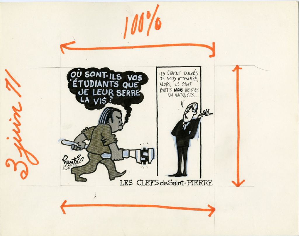 Les clefs de Saint- Pierre. [Saint-Pierre] : «Où sont-ils vos étudiants que je leur serre la vi$?» «Ils étaient tannés de vous attendre, alors, ils sont partis nous reposer en vacances…»
