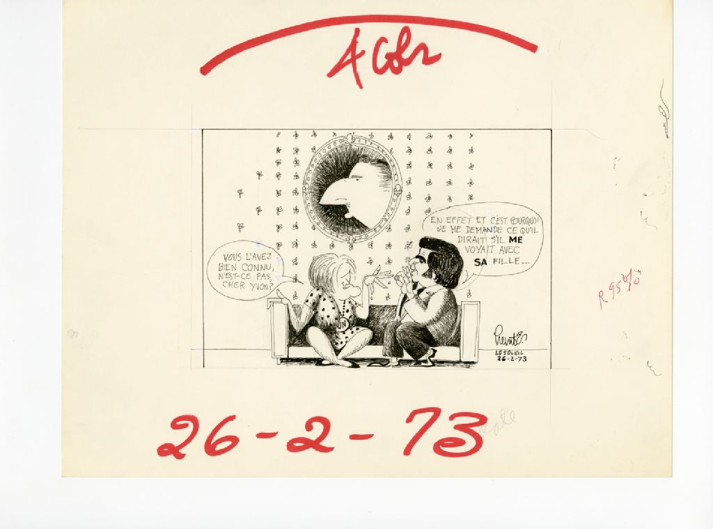 "Vous l'avez bien connu, n'est-ce pas, cher Yvon?" "En effet et c'est pourquoi je me demande ce qu'il dirait s'il me voyait avec sa fille...", 26 février 1973, Archives nationales à Québec, Fonds Raoul Hunter, (03Q,P716,S1,P73-02-26), Raoul Hunter.