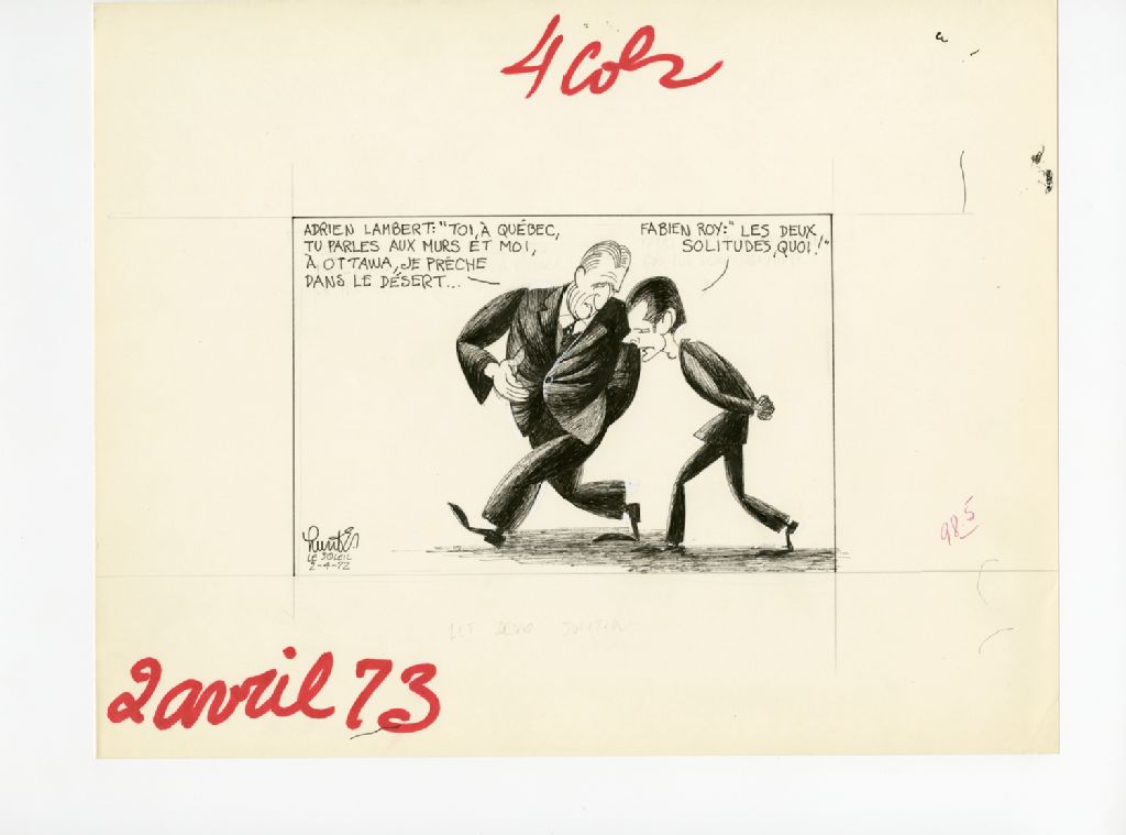 Adrien Lambert: "Toi, à Québec, tu parles aux murs et moi, à Ottawa, je prche dans le désert..." Fabien Roy: "Les deux solitudes, quoi!"