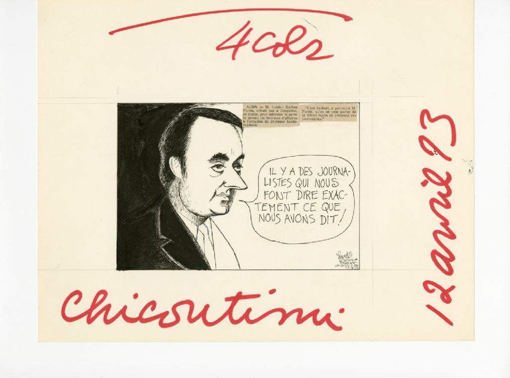 On peut lire sur une coupure de presse : "Alma - M. Louis-Gaétan Fortin n'était pas à Jonquière ce matin, pour adresser la parole devant les hommes d'affaires à l'occasion du déjeuner hebdomadaire. "C'est évident, à poursuivi M. Fortin, qu'on ne peut pas parler de la même façon en présence des journalistes."