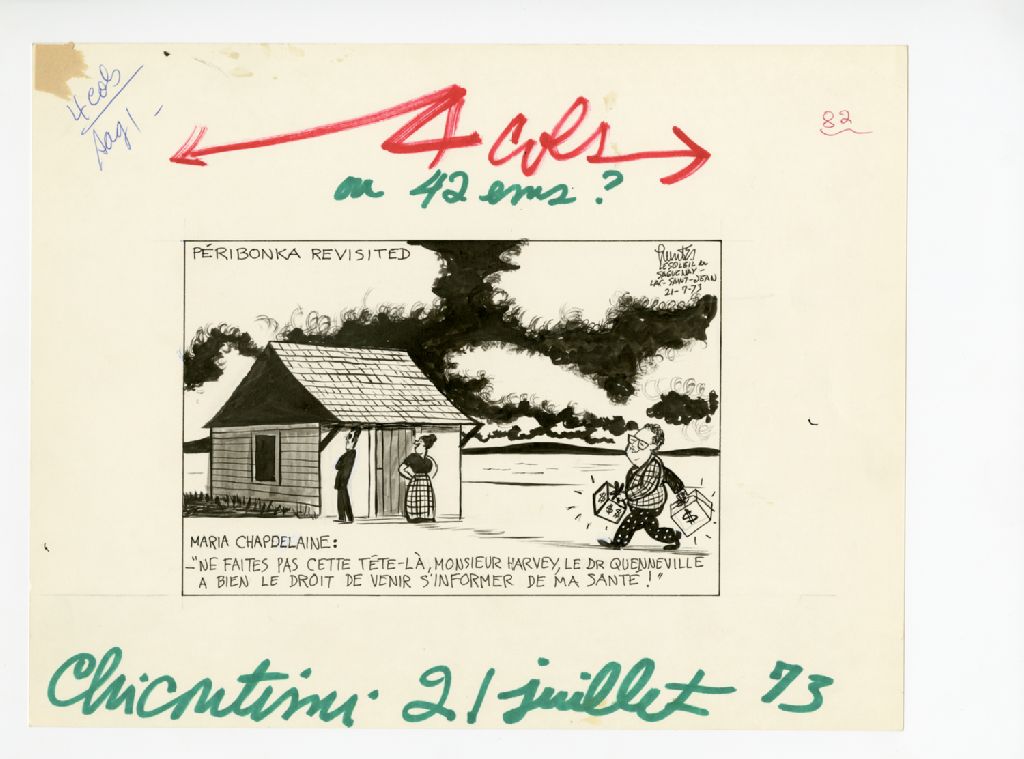 Péribonka revisited. Maria Chapdelaine: "Ne faites pas cette tête-là, monsieur Harvey, le Dr. Quenneville a bien le droit de venir s'informer de ma santé!"