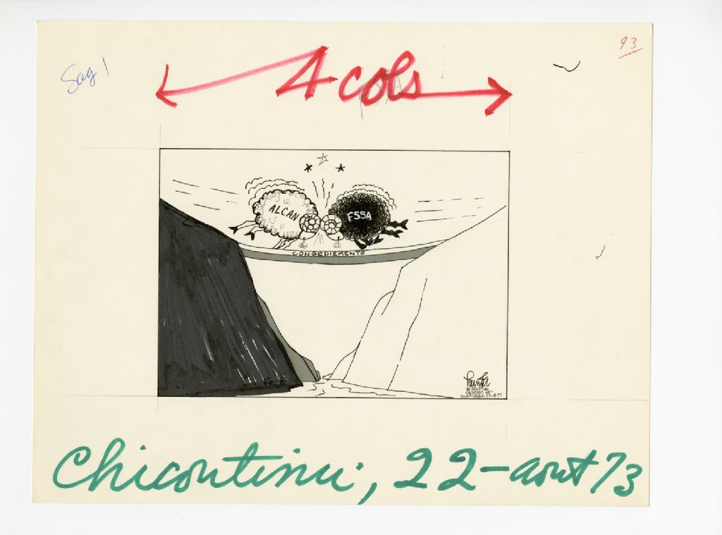 [Deux boucs entre en collision sur un pont. Sur le pont est écrit ''congédiements,, et sur les boucs ''ALCAN'' et ''FSSA'']