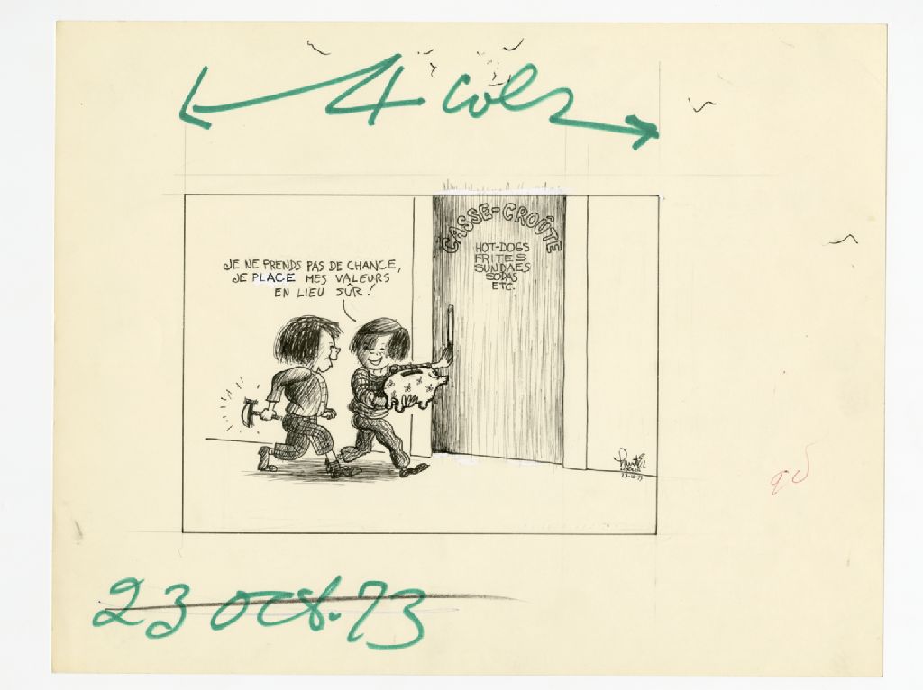 "Je ne prends pas de chance, je place mes valeurs en lieu sûr!", 23 octobre 1973, Archives nationales à Québec, Fonds Raoul Hunter, (03Q,P716,S1,P73-10-23-1), Raoul Hunter.