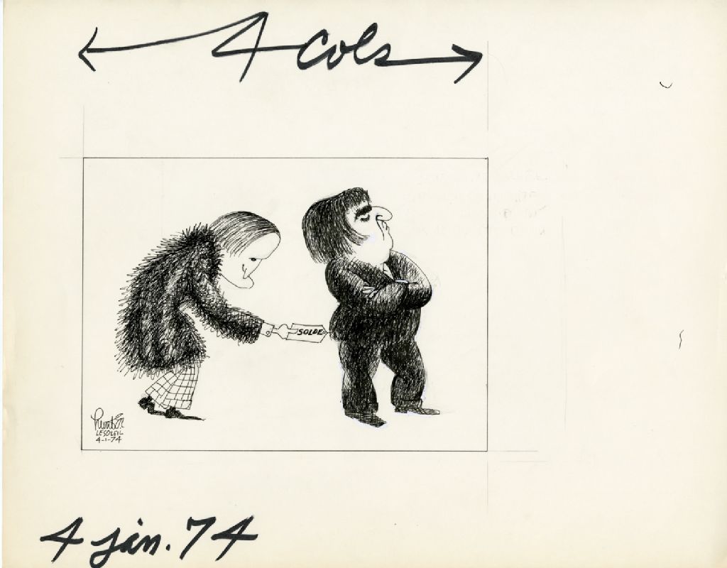 [Gabriel Loubier regarde une étiquette qui dépasse du manteau d'Yvon Dupuis]