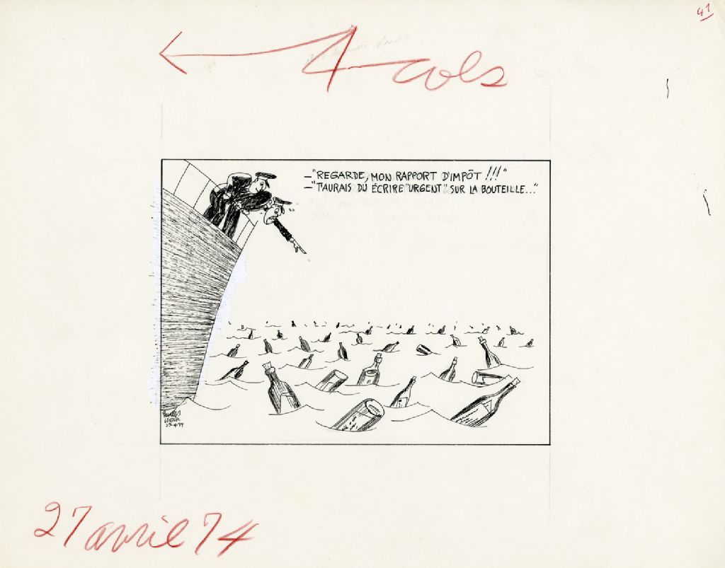 «Regarde, mon rapport d'impôt!!!» «T'aurais dû écrire «Urgent» sur la bouteille...», 27 avril 1974, Archives nationales à Québec, Fonds Raoul Hunter, (03Q,P716,S1,P74-04-27), Raoul Hunter.