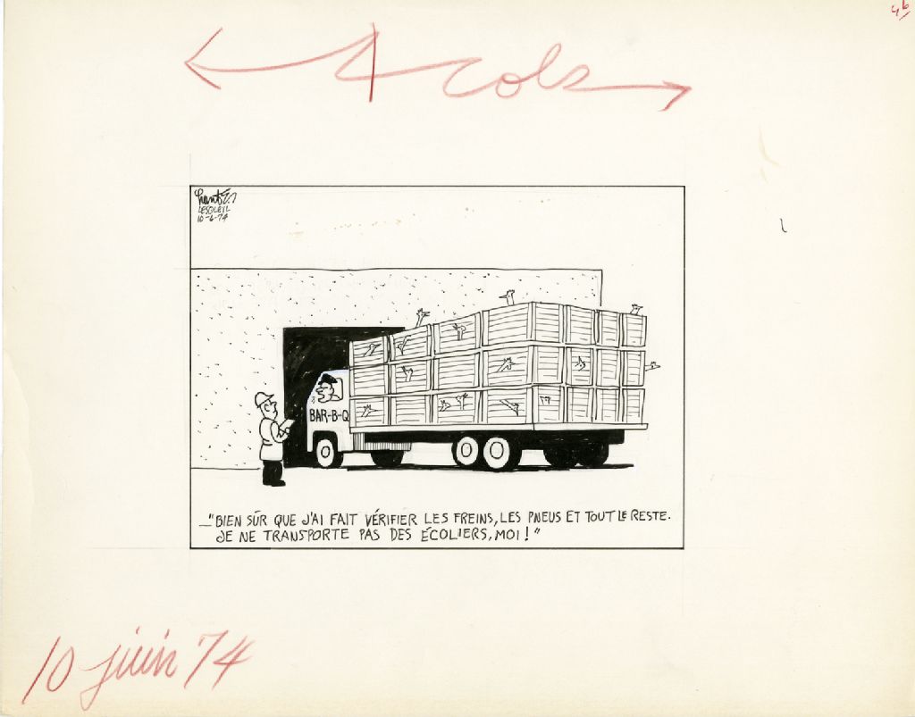 «Bien sûr que j'ai fait vérifier les freins, les pneus et tout le reste. Je ne transporte pas des écoliers, moi!», 10 juin 1974, Archives nationales à Québec, Fonds Raoul Hunter, (03Q,P716,S1,P74-06-10), Raoul Hunter.