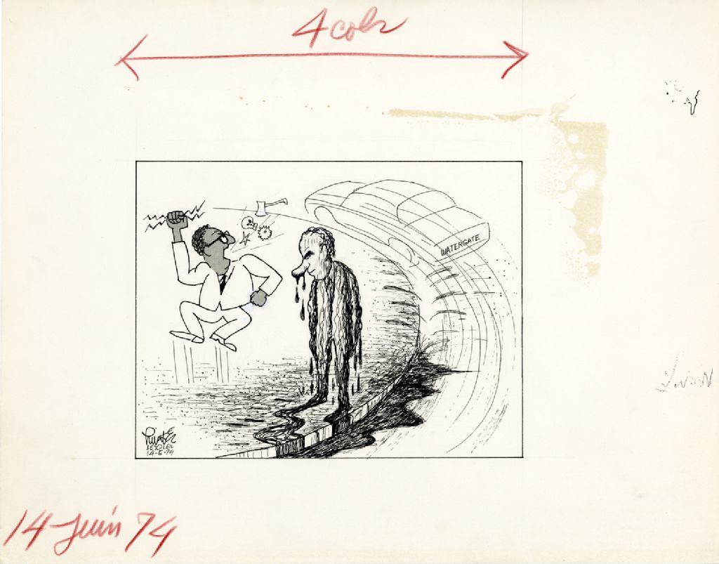 [Richard Nixon couvert de pétrole], 14 juin 1974, Archives nationales à Québec, Fonds Raoul Hunter, (03Q,P716,S1,P74-06-14), Raoul Hunter.