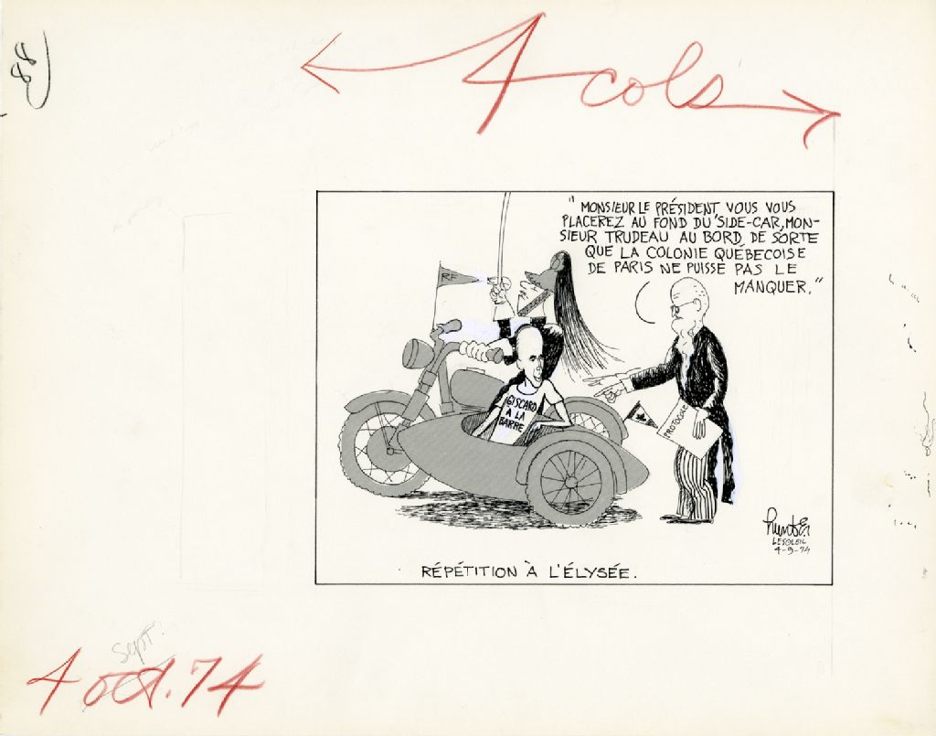 Répétition à l'Élysée. «Monsieur le président, vous vous placerez au fond du side-car, monsieur Trudeau au bord de sorte que la colonie québécoise de Paris ne puisse pas le manquer.», 4 septembre 1974, Archives nationales à Québec, Fonds Raoul Hunter, (03Q,P716,S1,P74-09-04), Raoul Hunter.