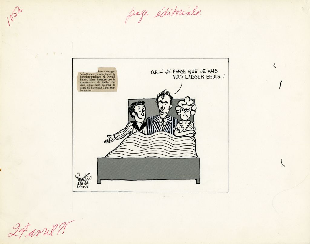On peut lire sur une coupure de presse collée sur le dessin : «Sans s'engager formellement, le ministre de la Fonction publique, M. Oswald Parent, laisse entendre que le gouvernement du Québec devrait logiquement accorder le congé de maternité à ses fonctionnaires.»