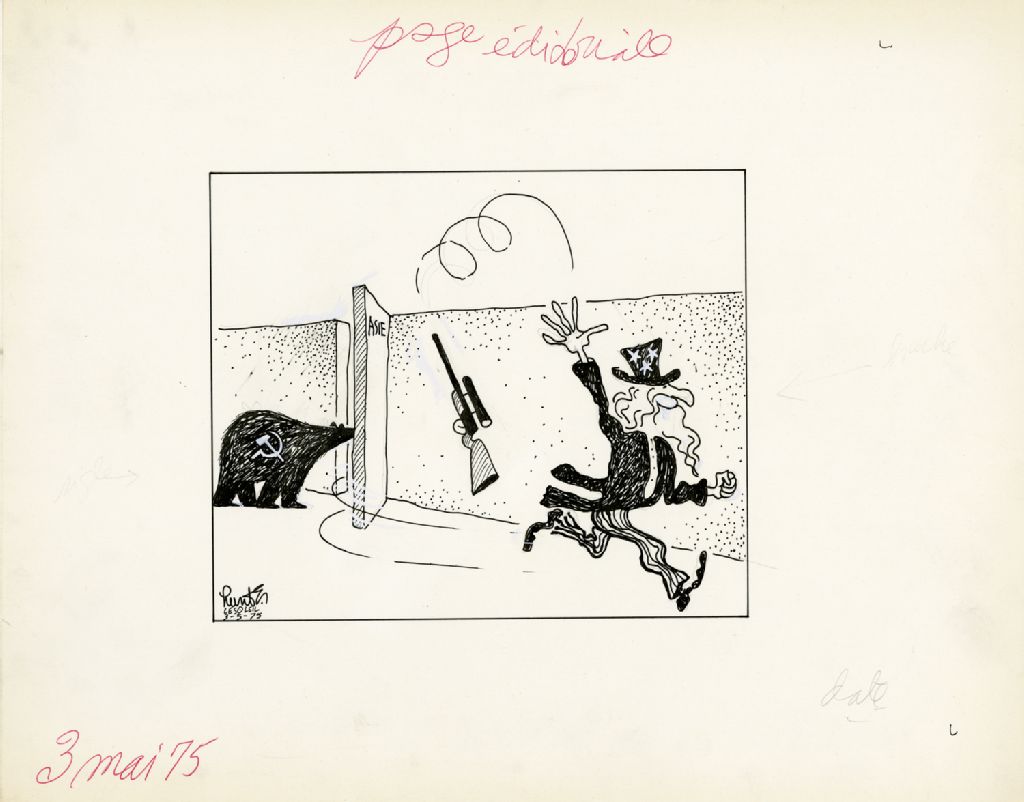 [Un ours noir où il est écrit URSS regarde dans un fort où il est écrit Asie. Uncle Sam jette son fusil et se sauve]