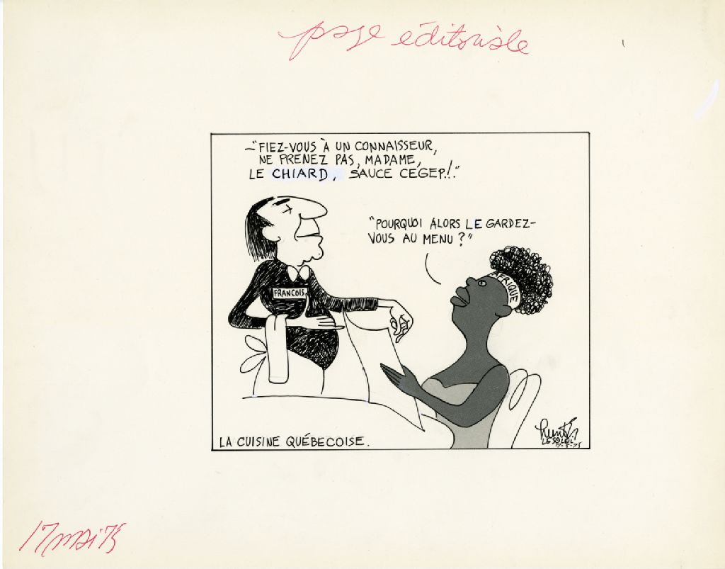La cuisine québécoise. «Fiez-vous à un connaisseur, ne prenez pas, madame, le chiard, sauce Cégep!...» «Pourquoi alors le gardez-vous au menu?»