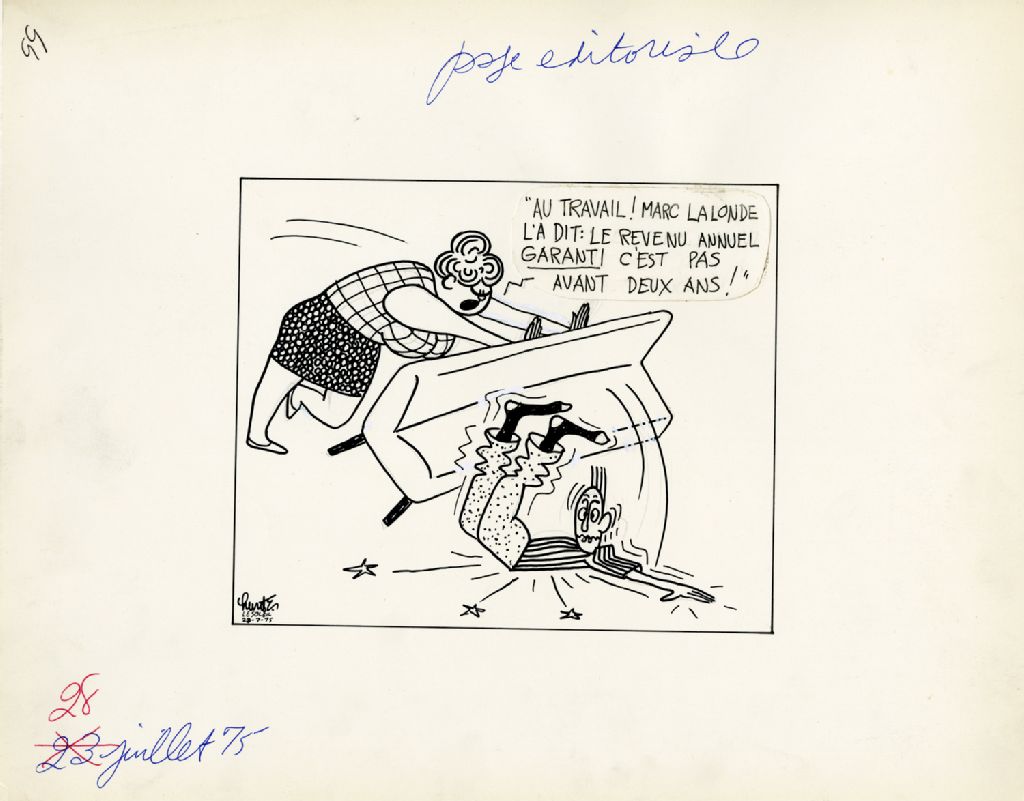 «Au travail! Marc Lalonde l'a dit : le revenu annuel garanti c'est pas avant deux ans!»