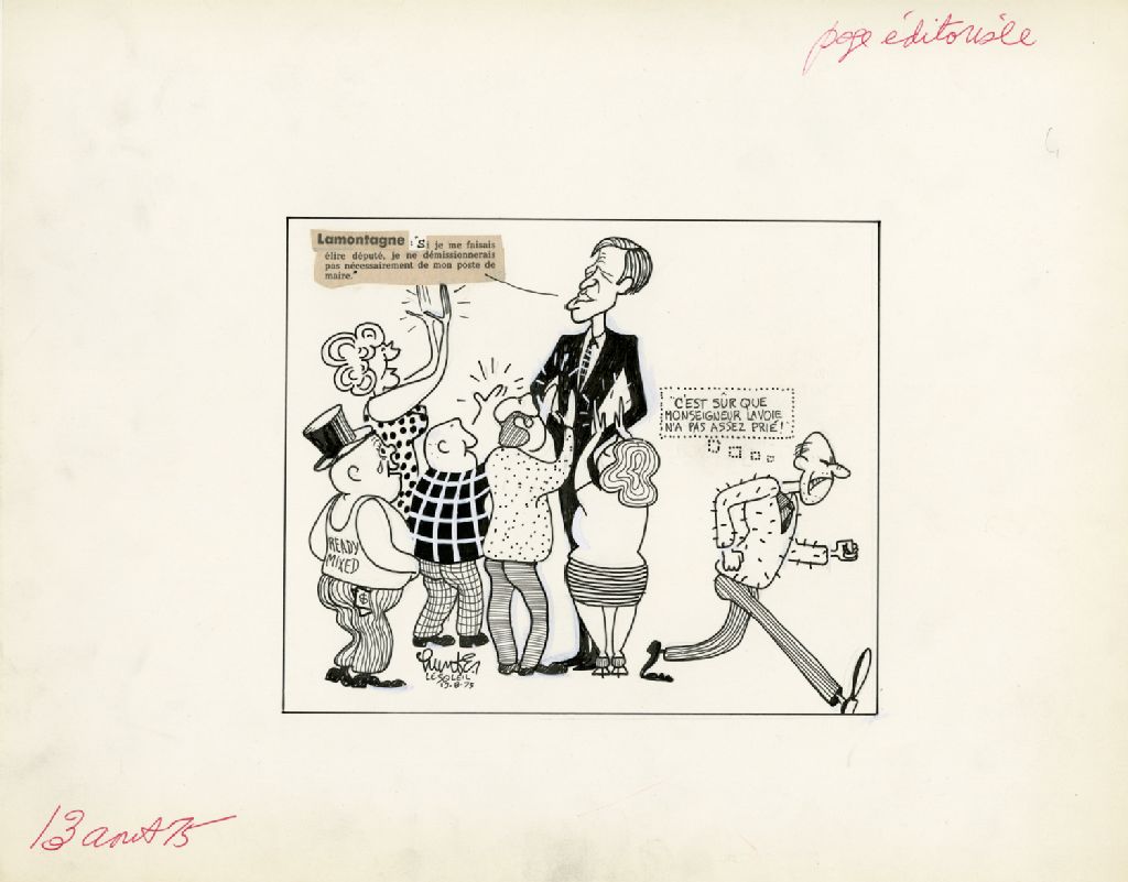 On peut lire sur une coupure de presse collée sur le dessin : «Lamontagne : Si je me faisais élire député, je ne démissionnerais pas nécessairement de mon poste de maire.»