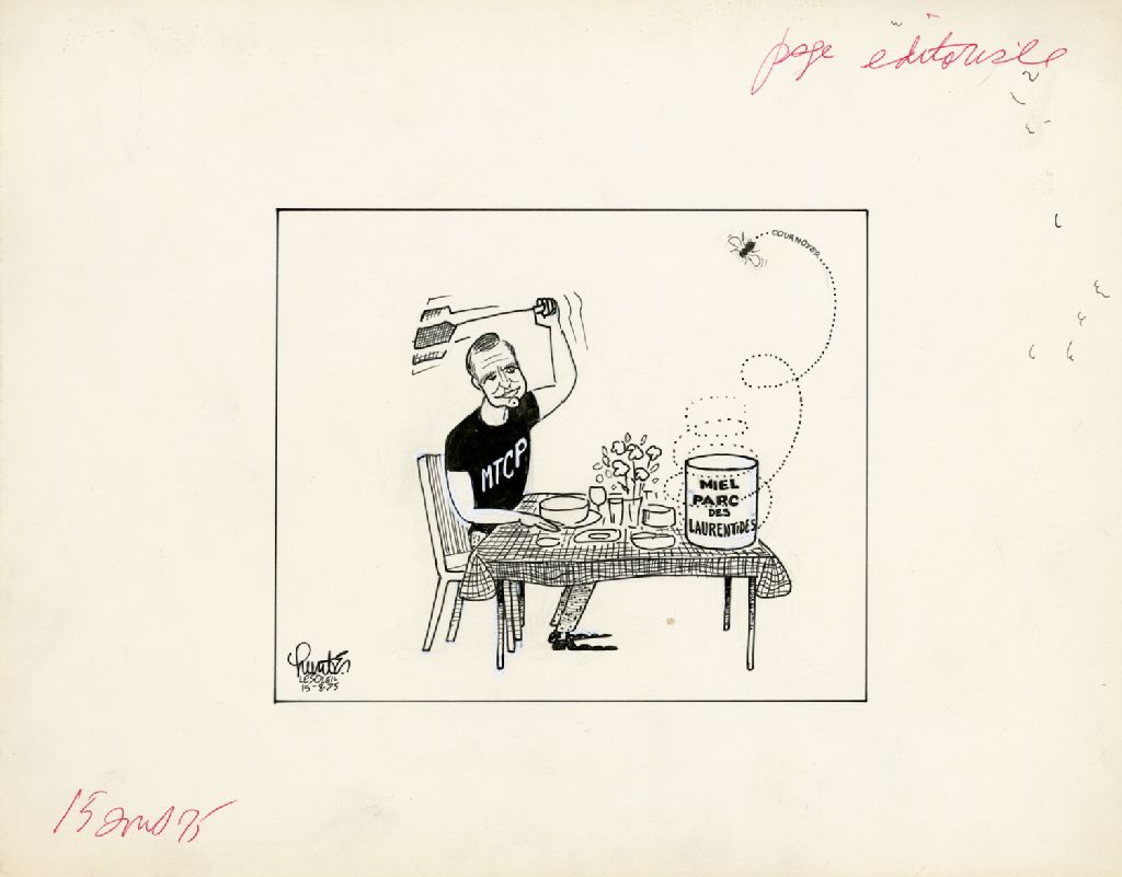 [Un homme essaie de frapper une abeille], 15 août 1975, Archives nationales à Québec, Fonds Raoul Hunter, (03Q,P716,S1,P75-08-15), Raoul Hunter.