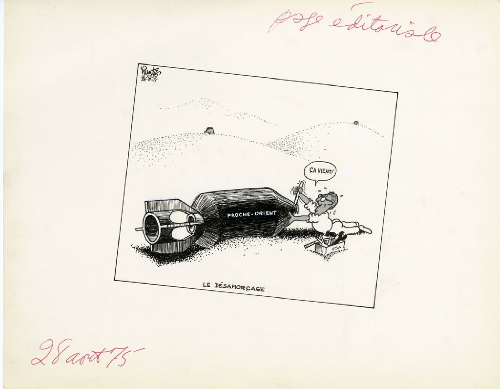 Le désamorçage. «Ça vient!», 28 août 1975, Archives nationales à Québec, Fonds Raoul Hunter, (03Q,P716,S1,P75-08-28), Raoul Hunter.