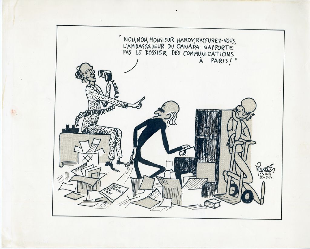 «Non, non, monsieur Hardy, rassurez-vous, l'ambassadeur du Canada n'apporte pas le dossier des communications à Paris!», 30 août 1975, Archives nationales à Québec, Fonds Raoul Hunter, (03Q,P716,S1,P75-08-30), Raoul Hunter.