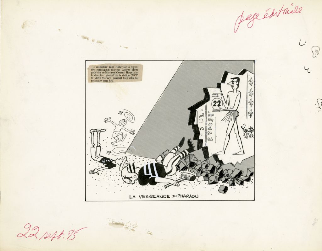 On peut lire sur une coupure de presse collée sur le dessin : «L'animateur John Robertson a rejoint son compagnon d'armes Georges Springate hier au Montreal General Hospital et le directeur général de la station CFCF, M. John Mackey, pourrait bien aller les retrouver sous peu.»